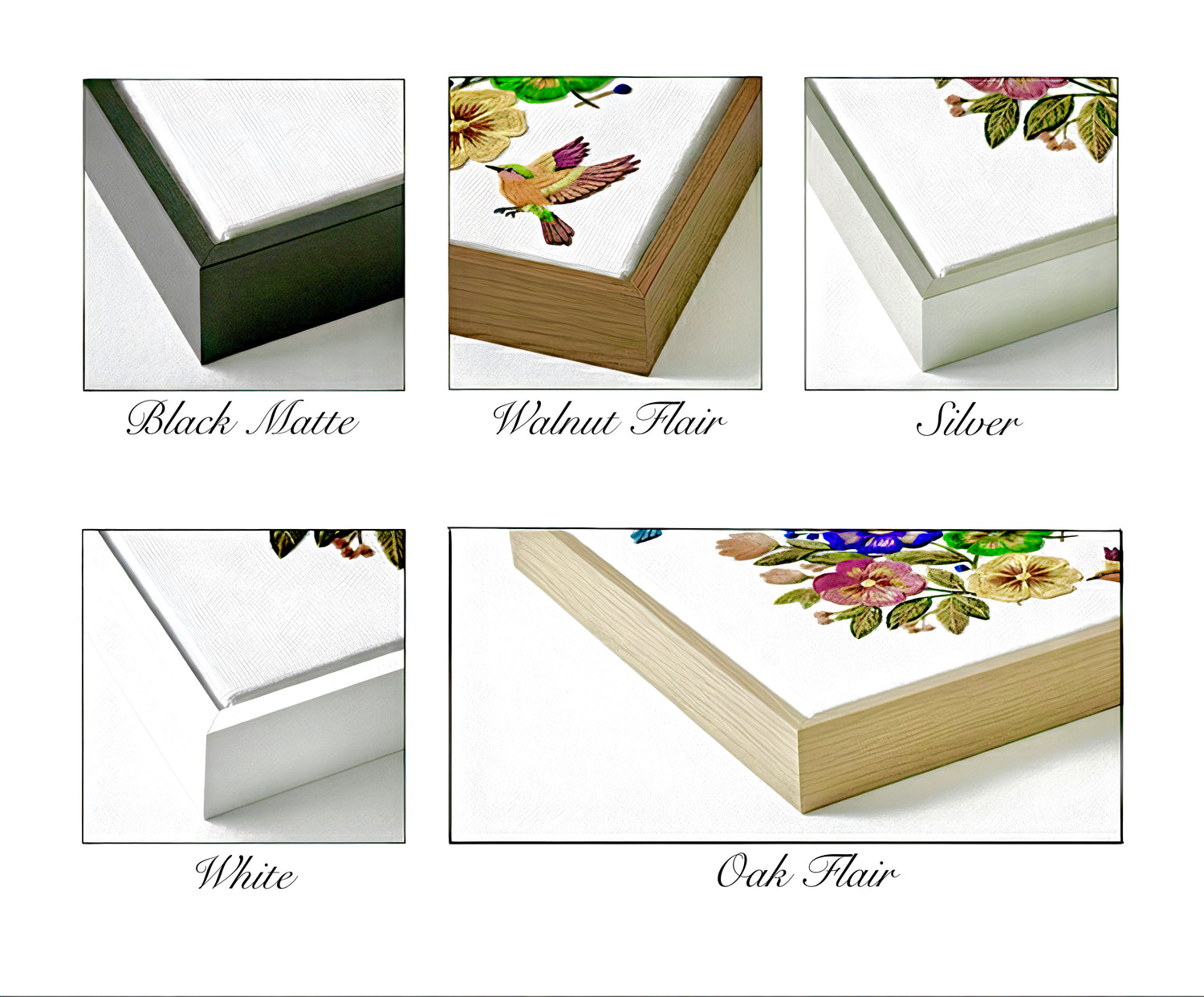 These framed canvases combine a premium, hand-stretched 100% polyester canvas over a pinewood frame with a stylish decorative floating frame made from high-grade 100% recycled plastic for enduring quality. The decorative frame comes in several floating frame options: